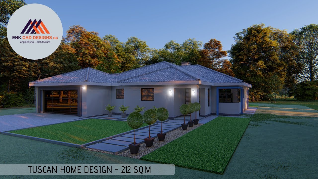 This design has main bedroom with en-suite, guest bedroom with its own bathroom, guest toilet, bath, 2 standard bedrooms, a living room, dining room, kitchen, scullery, outdoor braai area and double garage. It occupies an area of 212 SQ.M. Minimum recommended lot area = 300 SQ.M