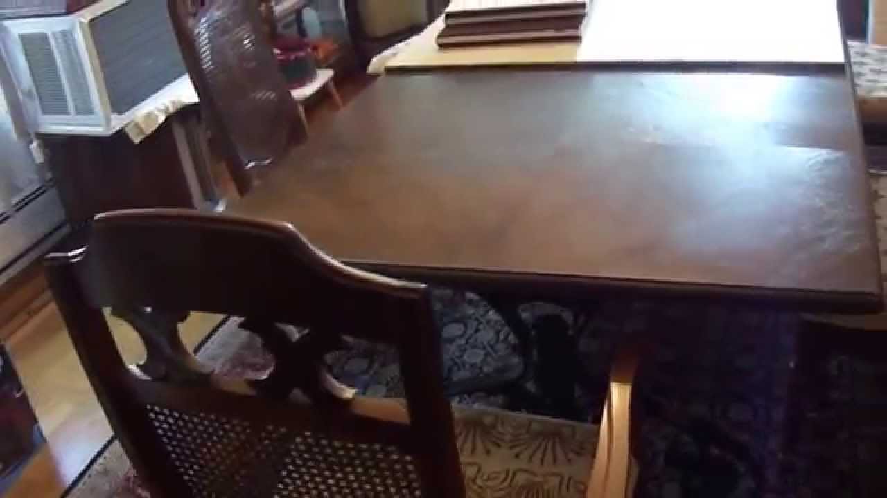 Large Italian Style Dining Room Table Looks like Dark Oak / Light Walnut Wood with Six Caine Style Backings and Needle Point Stitching Seat Bottom Upholstery.