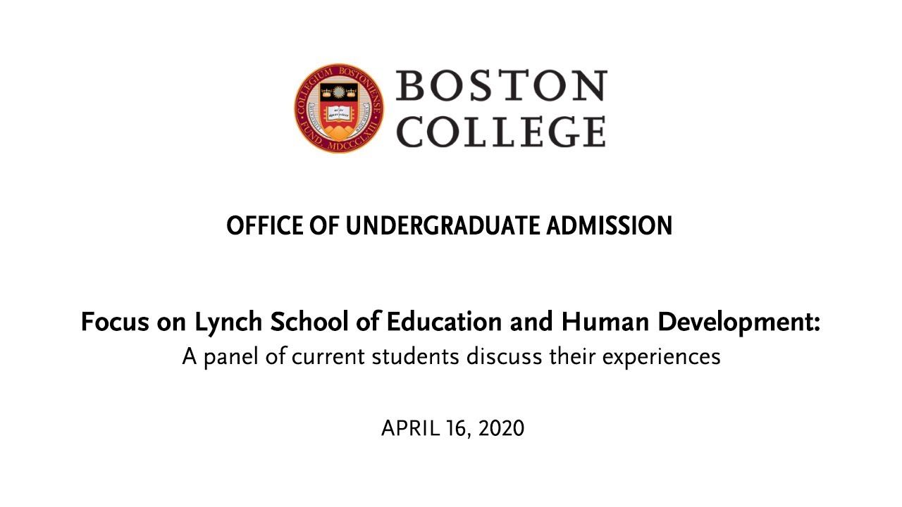 Boston College’s Office of Undergraduate Admission hosts a series of webinars for admitted students in the Class of 2024. On April 15, 2020, Associate Director Chris O’Brien moderated a panel of current students enrolled in the Lynch School of Education and Human Development to discuss their majors, classes, and individual experiences. They also answered attendees’ questions.