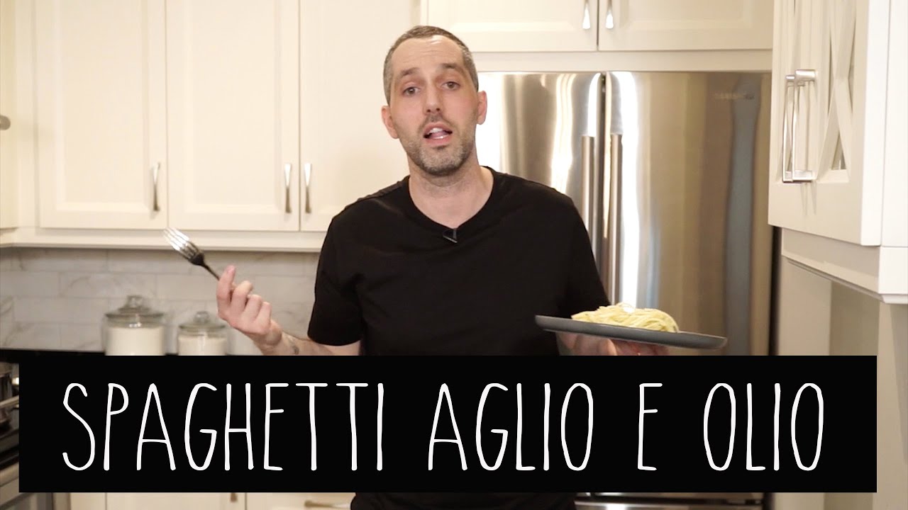 2. In a large frying pan over low-medium heat, heat extra virgin olive oil. Add garlic and saute until lightly browned and tender. Add a ladle full of pasta water and cook it down a bit. Add spaghetti and finish cooking, mixing and tossing, adding more pasta water, if needed.