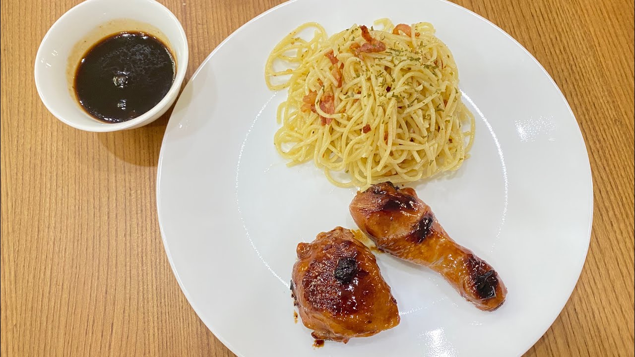 Starting with my Bacon Aglio e olio pasta and sweet and spicy teriyaki chicken.