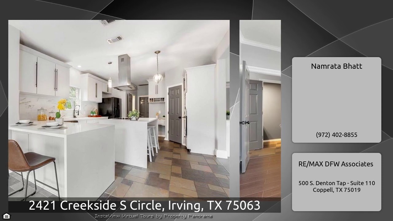 The Virtual Tour for the property at 2421 Creekside S Circle, Irving, TX 75063 listed for $595,000: Other homes for sale by Namrata Bhatt of RE/MAX DFW Associates: Hackberry Creek Estates offering golf and many community gatherings,Gated Community,this is totally remodeled floor plan utilizes an open concept throughout.Marble entry is flanked by formal living and dining,soaring ceilings and porcelain wood tile flooring.Three tone elegant paint in gray tones and porcelain wood tile flooring. State-of-the-art kitchen features SS appliances, Gas Line for Cook-Top, Italian slate flooring, white …